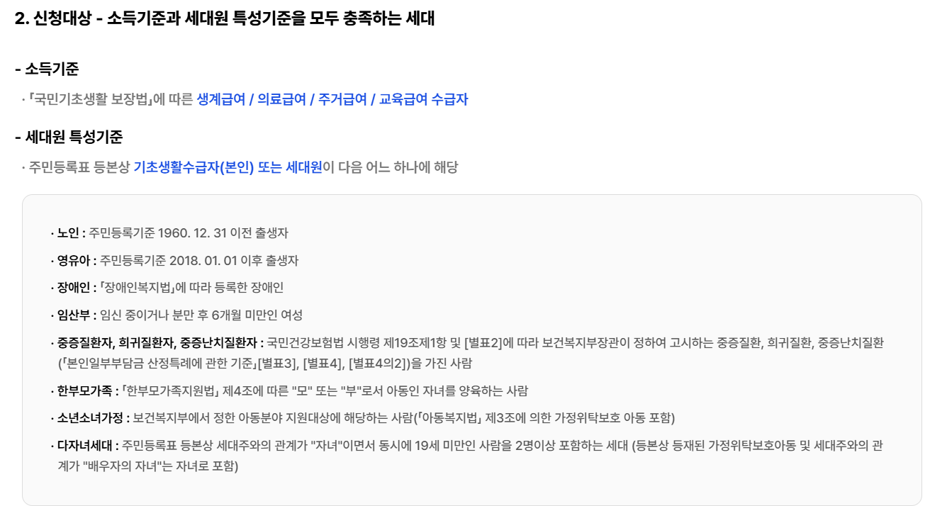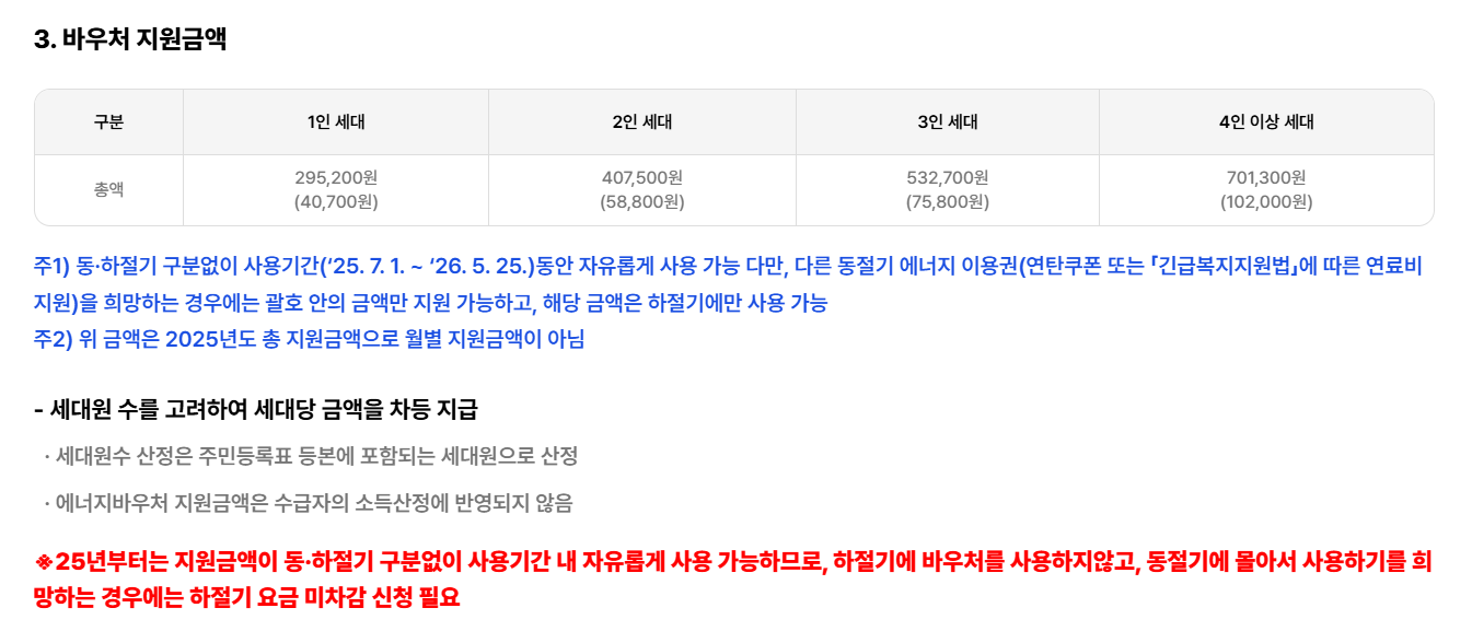| 에너지바우처 | 요금자동차감·국민행복카드 바우처 | 1인 29.5만 ~ 4인 이상 70.1만 원 | 전기·가스·등유·LPG 가능 |