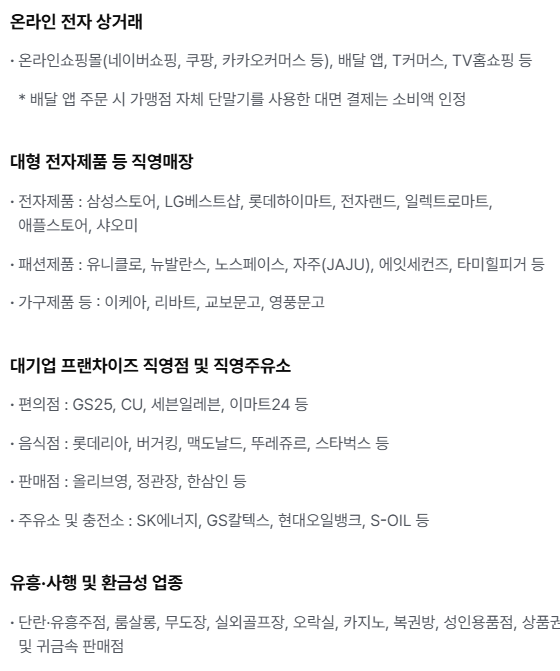 공식 안내에서는 주로 사용 불가 업종 위주로 설명되어 있어 실제 사용처가 다소 모호하게 느껴질 수 있습니다. 직접 사용해본 기준으로는 다음과 같은 곳에서 적용됐습니다.