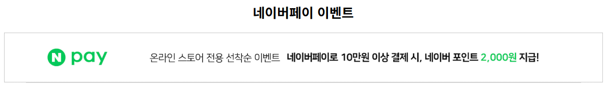 온라인 스토어 전용 이벤트로, 오직 네이버 pay로 10만원 이상 결제 시, 2000포인트를 받을 수 있는데요. 다들 아시겠지만 네이버 포인트는 갖고 있으면 여기저기 쓸만한데가 상당히 많기 때문에, 이왕 구매하실거면 이용해보셔도 좋을듯 해요.