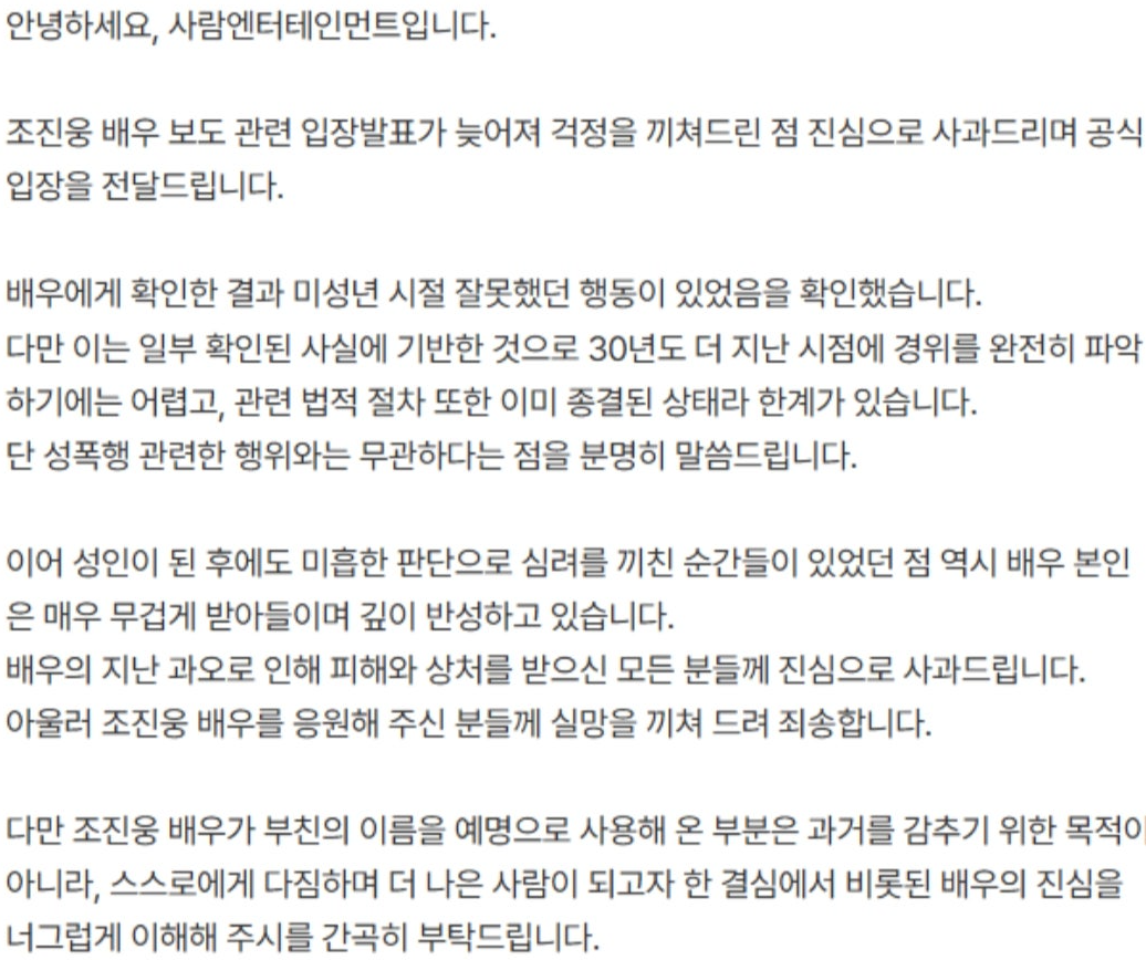 즉, 소년원에 갔다는 사실은 인정하지만 성폭행 의혹은 소속사에서 분명하게 반박한 상태이며, 이 부분은 조진웅 본인도 일관되게 부인해왔기에 사실과 다르다는것이죠.