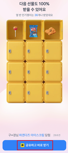 선물을 받고, 공유하고 또 다시 기회를 얻는 구조라 조금만 전략적으로 참여하면 선물을 받을 수 있는