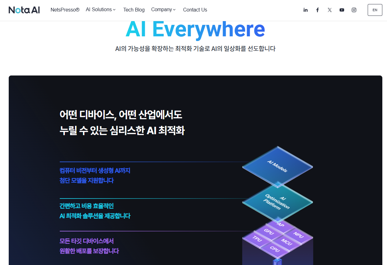 AI 모델 경량화 및 추론 최적화 솔루션을 개발하는 기업으로, 글로벌 AI 칩 시장 성장과 맞물려 빠르게 주목받고 있습니다. 정부와 대기업 납품 경력도 풍부하며, 인공지능 엣지 컴퓨팅 분야의 선도 기업입니다. Nota AI