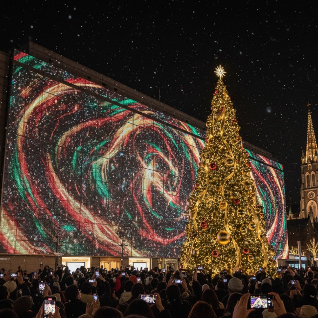명동 거리가 겨울이면 더 화려해지는 이유, 바로 신세계백화점의 크리스마스 연출 때문이죠. 건물 외벽 전체를 활용한 미디어파사드와 클래식한 대형 트리가 어우러져 사진을 찍기만 해도 연말 분위기가 가득 담겨요.